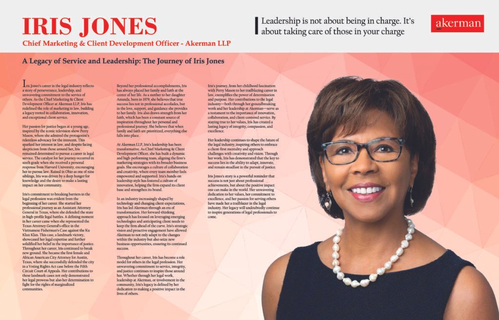 Iris Jones’s career in the legal industry reflects a story of perseverance, leadership, and unwavering commitment to the service of others. As the Chief Marketing & Client Development Officer at Akerman LLP, Iris has redefined the role of marketing in law, building a legacy rooted in collaboration, innovation, and exceptional client service.